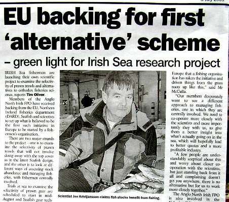 Members of the Anglo North Irish FPO have received backing from the EU, Northem Ireland fisheries department (DARD), Seafish and scientists to set up what is believed to be the first such initiative in Europe to be started by a fishermens organisation.There are two major strands to the project - one is to examine the selectivity of prawn trawls that will not iilvolve doing away with the top cover as in the latest Seafish design, and the other is to look at different ways of assessing stock abundance and managing fisheries, with fishermen eentrally involved.