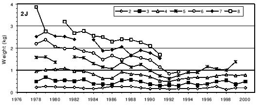 Fig. 2. Mean weights at ages 2-8 of cod in division 2J (Labrador), as determined from sampling during bottom-trawl surways in autumn. Note that in 1994 fish older than 5 have disappeared and the average maximum weight is less than one kg.