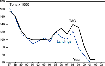 The main advice from the scientists has been to reduce the fishing effort and it is interesting to examine how the recommendations have been adhered to. Below is a graph that shows the TAC set by the politicians and the landings in the period 1987-2001.