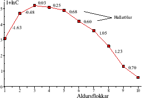 Á mynd 1 hef ég tekið náttúrulegan lógaritma af fimm ára meðaltali fjölda fiska í hverjum gotflokki. Á myndinni sést að á sumum tímabilum fer ekki fjöldi gotfiska að falla fyrr en við aðra eða þriðju hrygningu, sem segir að fiskurinn sé ekki að fullu kominn til hrygningar fyrr en þegar hann hrygnir í þriðja sinn. Það verður því að draga í efa að að sýnið sé marktækt; Yngsti eða smæsti fiskurinn getur hafa farið fram hjá sýnatökunni.