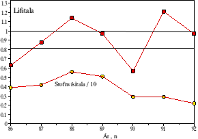Athyglisvert er að skoða þessar lifitölumælingar í samhengi við vísitölu heildarstofnsins. Á mynd 4 hefur lifitalan verið dregin upp ásamt vísitölu stofnsins á sama tíma. Þar má sjá að línurnar fylgjast að sem þýðir að veiðanleiki fisksins er breytilegur, fiskur veiðist misvel á hverju ári, og það þýðir aftur að afli á sóknareiningu (vísitala) er óábyggilegur mælikvarði á stofnstærð.