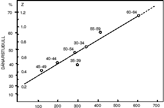 Út frá línunni má lesa að Z = 1,67 * (tímaeiningin á myndinni er hálft ár, því margfaldast hallatalan með tveimur) og útreikningar gefa:
