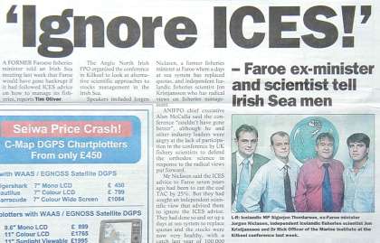 Thankfully, the "ICES Mafia" did not get it all their way and as already mentioned the Fisheries Departments in Belfast and Dublin were well represented in Kilkeel, as were local politicians including Iris Robinson MP. Industry representatives included Barrie Deas, NFFO, Alex Smith, SFF, Jim Portus, SWFPO, Tom Watson, Fleetwood FPO and Mark Dougal, NESFO from the UK, as well as Lorcan O'Cinneide, Irish FPO and Mick Walsh, Irish South & East Fishermen's Organisation from Ireland. A number of fishermen from around the Irish Sea took time off to attend the meeting and the Sea Fish Industry Authority were also represented, as were fish processors in the shape of Northern Ireland Seafood. In all, over fifty participants attended the workshop, which was chaired by Dr. Stephen Lockwood.