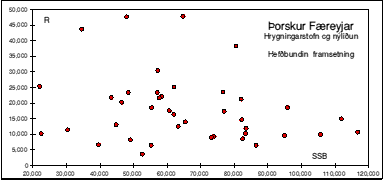 1. Hrygningarstofn þorsks við Færeyjar er ekkert stöðugt fyrirbæri. Hann sveiflast upp og niður með reglulegum hætti, frá 20 - 120 þús tonn. Að meðaltali er hann stór eins og Einar bendir á en verður ærið lítill á stundum. Sagði Einar ekki að hann væri stór vegna lítillar veiði og þess vegna væri nýliðun góð?