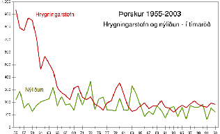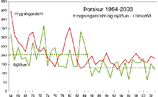 Hrygningarstofn og nýliðun í tímaröð 1955-2003. Hér má sjá stærð hrygningarstofnsins í tonnum á hverjum tíma og þá nýliðun, í milljónum 3 ára, sem hann gaf af sér. Stóri stofninn 1955-60 gaf alls ekki meira af sér en minni stofn síðar. Reyndar virðist nýliðun vera í öfugu hlutfalli við stærð hans.
