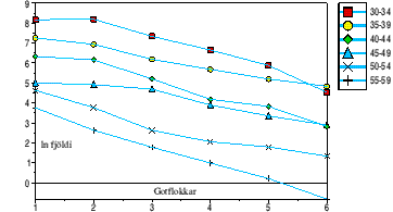 Á mynd 1 hef ég tekið náttúrulegan lógaritma af fimm ára meðaltali fjölda fiska í hverjum gotflokki. Á myndinni sést að á sumum tímabilum fer ekki fjöldi gotfiska að falla fyrr en við aðra eða þriðju hrygningu, sem segir að fiskurinn sé ekki að fullu kominn til hrygningar fyrr en þegar hann hrygnir í þriðja sinn. Það verður því að draga í efa að að sýnið sé marktækt; Yngsti eða smæsti fiskurinn getur hafa farið fram hjá sýnatökunni.