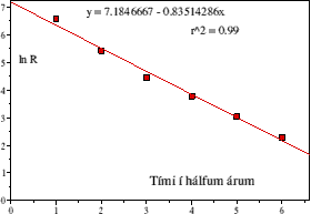 Þessar tölur sýna að endurheimtur falla um helming á hverju hálfu ári sem líður frá merkingu. Þegar þetta er sett upp í línurit fæst það samhengi sem sýnt er á mynd 5.