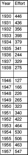 Í fyrstu greininni [Jón Jónsson 1960] notar Jón þrjú tímabil til þess að reikna línuna (fig. 4). Hann notar ekki tímabilið 1939-1944, vegna þess að þá var sókn Breta engin, annarra þjóða utan Íslendinga reyndar ekki heldur, stríðsins vegna. Síðar [Jón Jónsson 1969, mynd 3 og Jón Jónsson 1990, mynd 37] hefur stríðsárunum verið bætt inn á línuritið, með sókninni u.þ.b. 200 milljón tonntímar, en gildi annarra punkta hefur yfirleitt verið lækkað frá því sem það var í fyrstu greininni [Jón Jónsson 1960]. Þetta er einkennilegt: Allt í einu er sókn Breta á stríðsárunum orðin umtalsverð, en þá voru engir breskir togarar hér við veiðar. Ekki getur verið um það að ræða að íslenska sóknin hafi verið tekin hér inn því þá hefði átt átt að bæta henni við öll hin árin einnig.